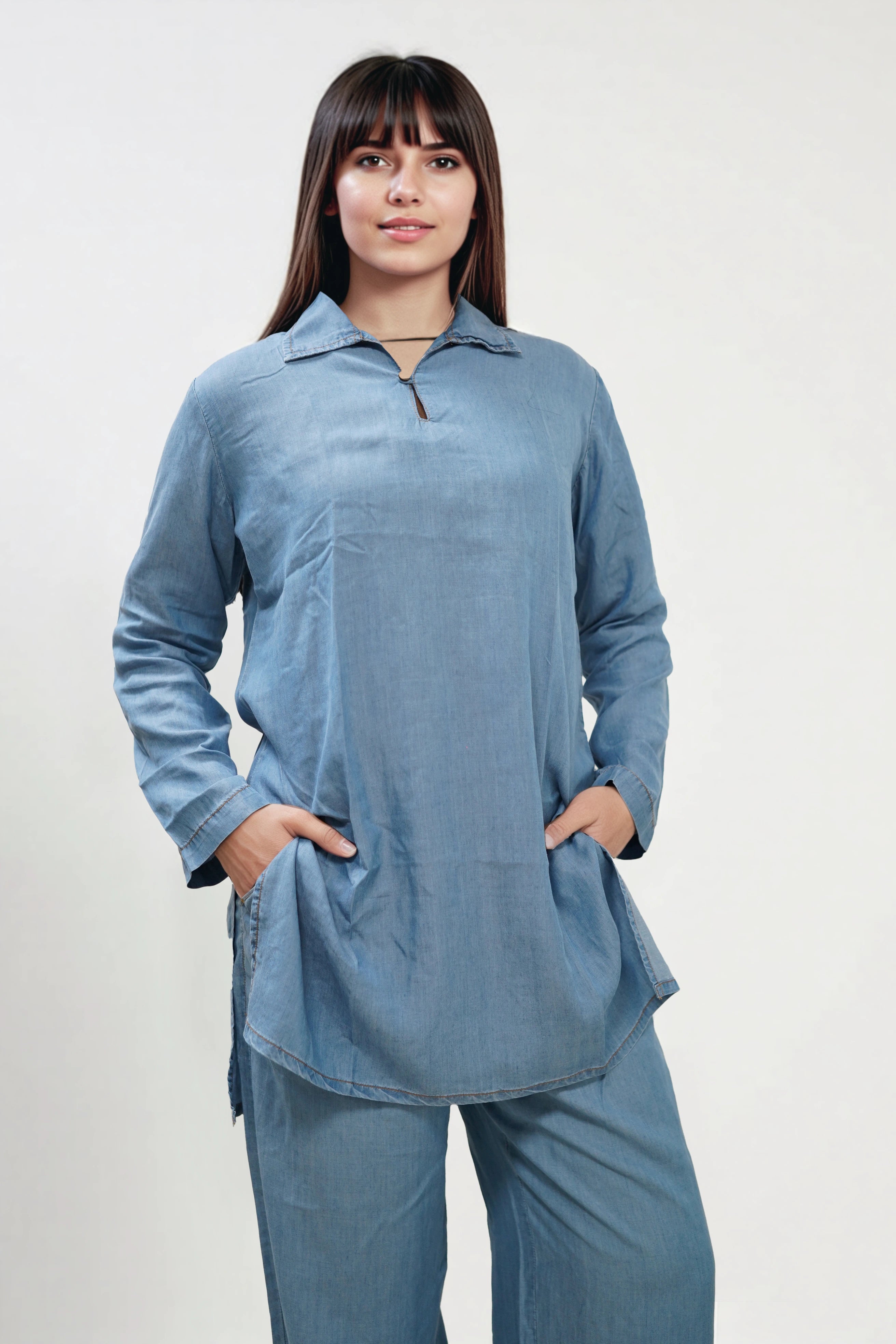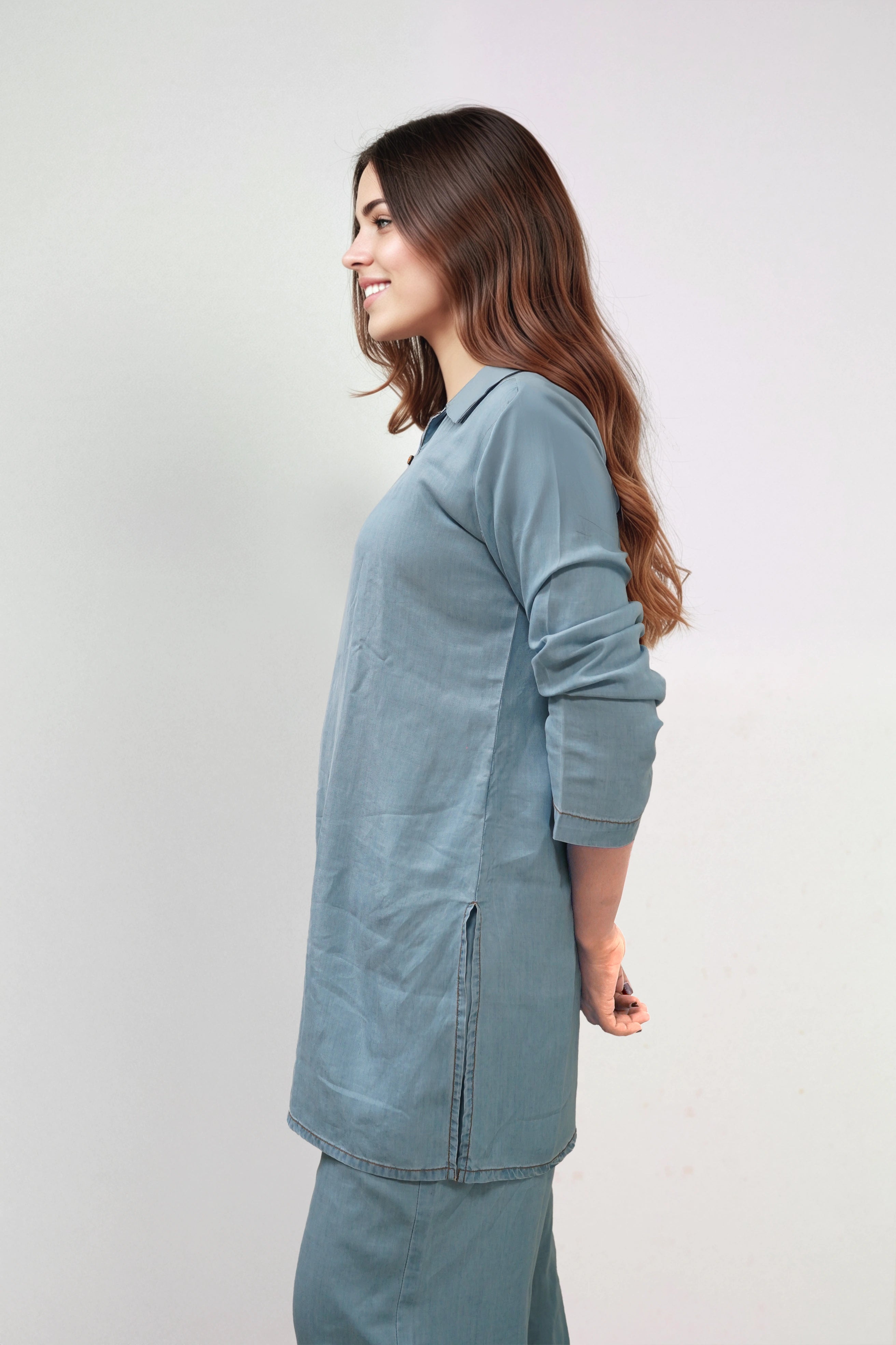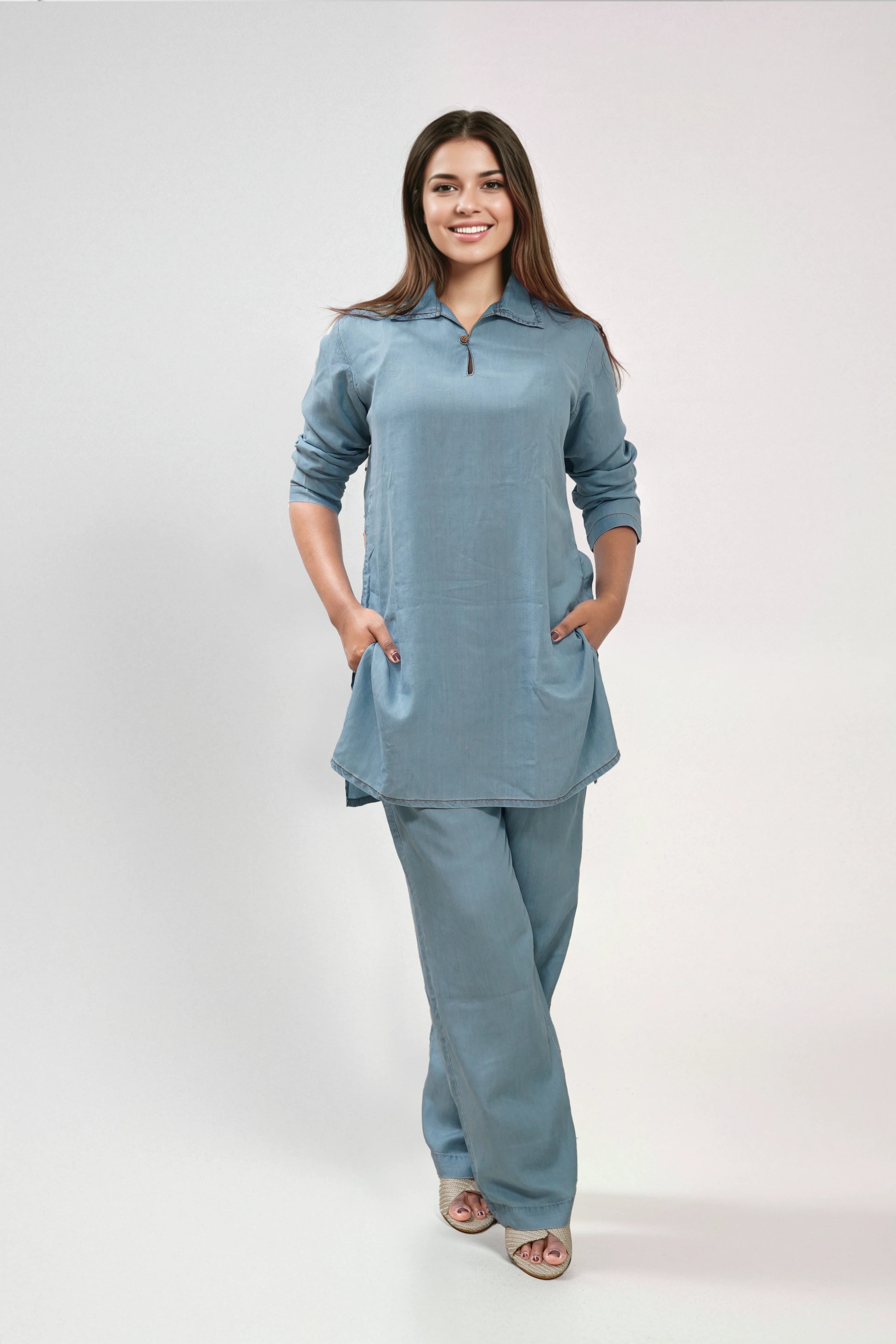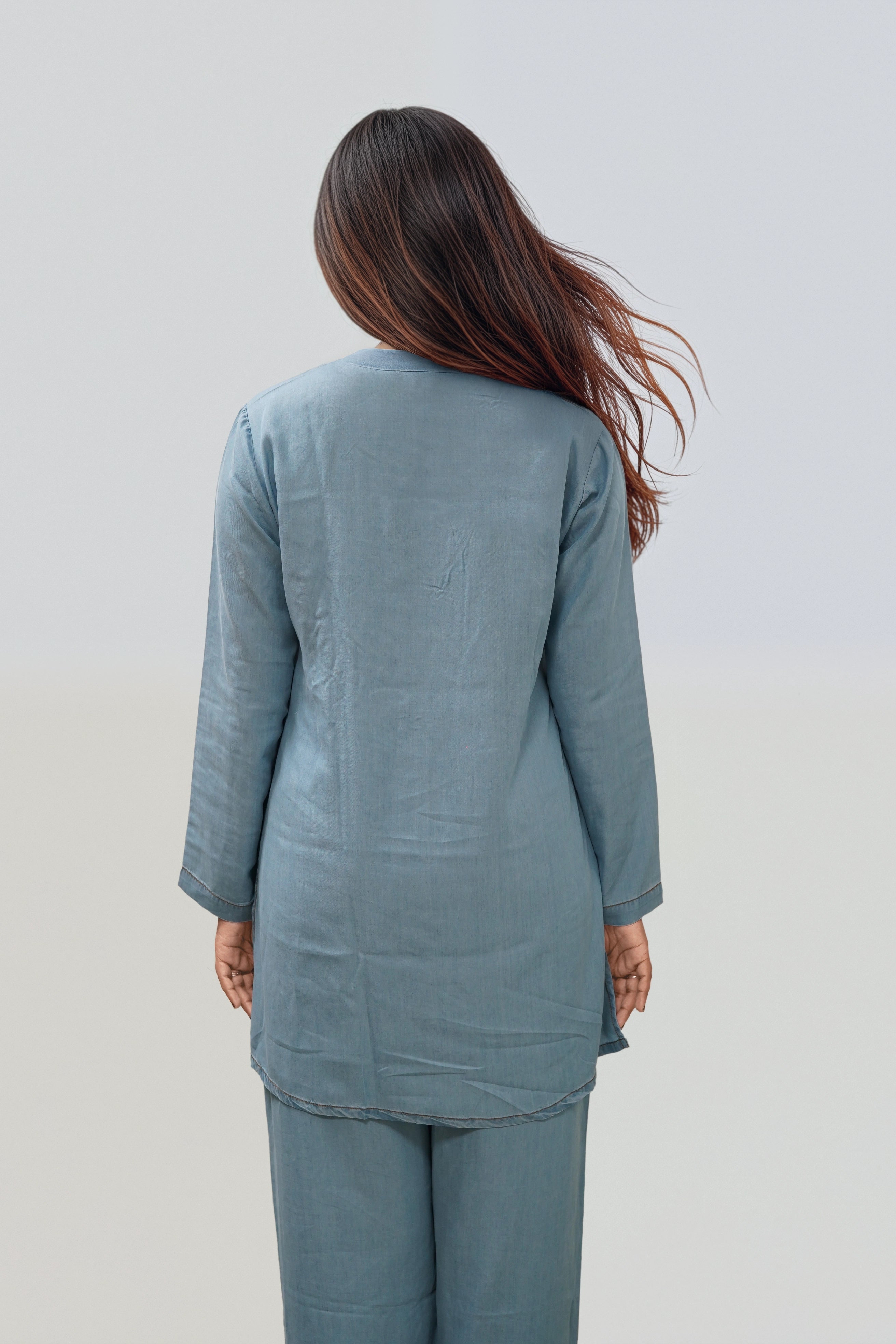 This kurti is all about understated style. Lightweight, breathable, and elegant, it’s a modern take on traditional wear. Tailored from breathable Tencel fabric, it’s lightweight and soft, finished with full sleeves and coconut shell buttons for a natural, modern look.