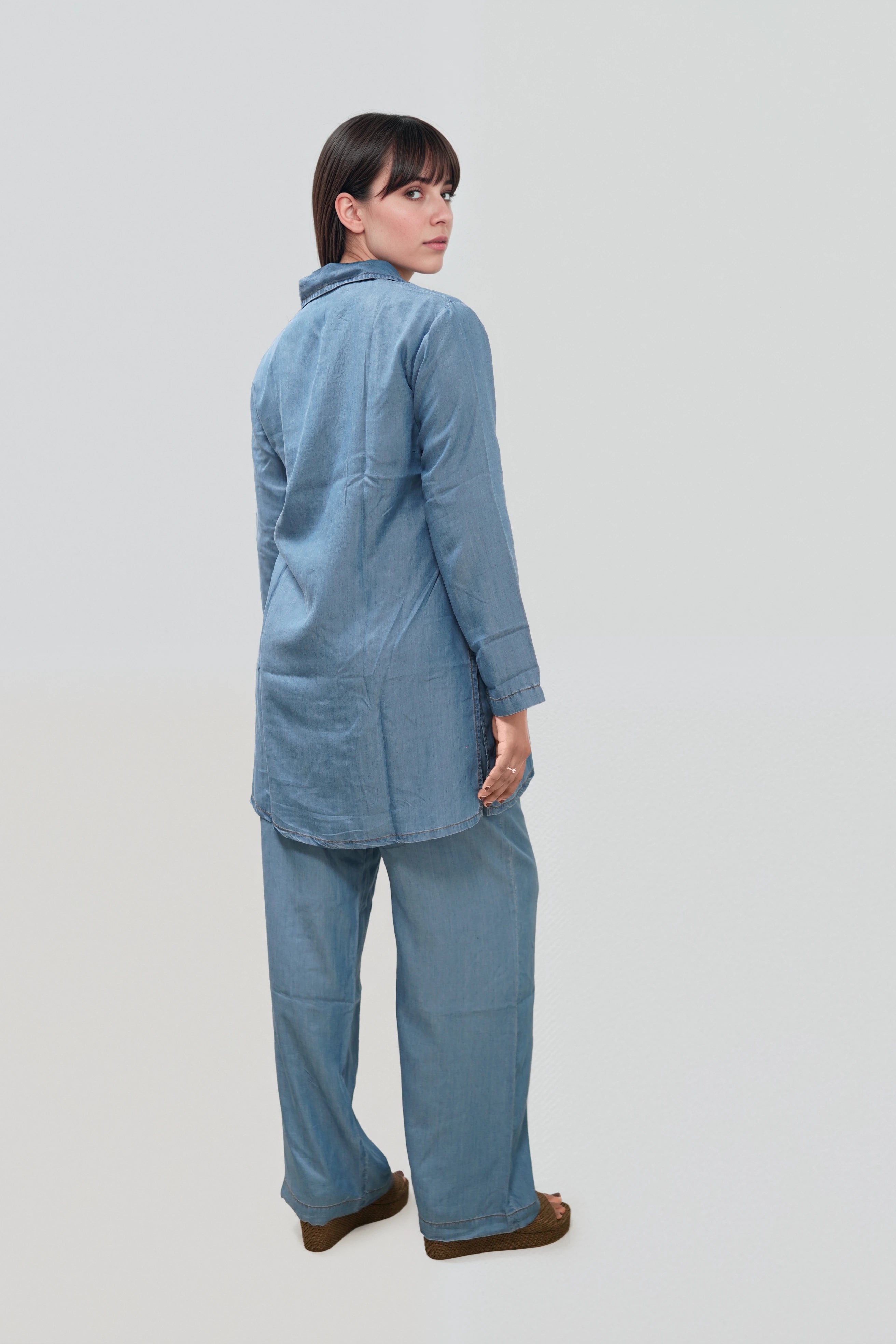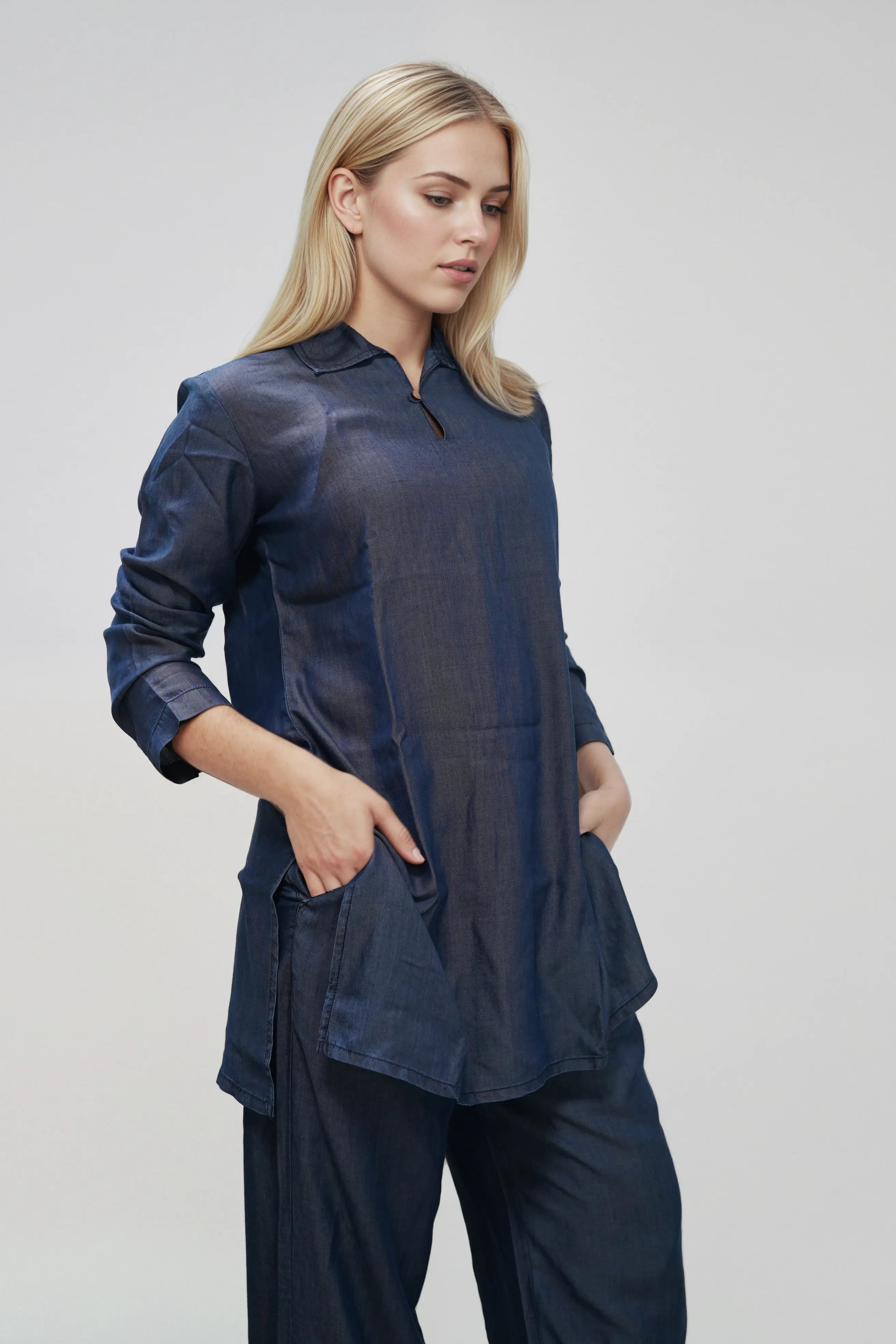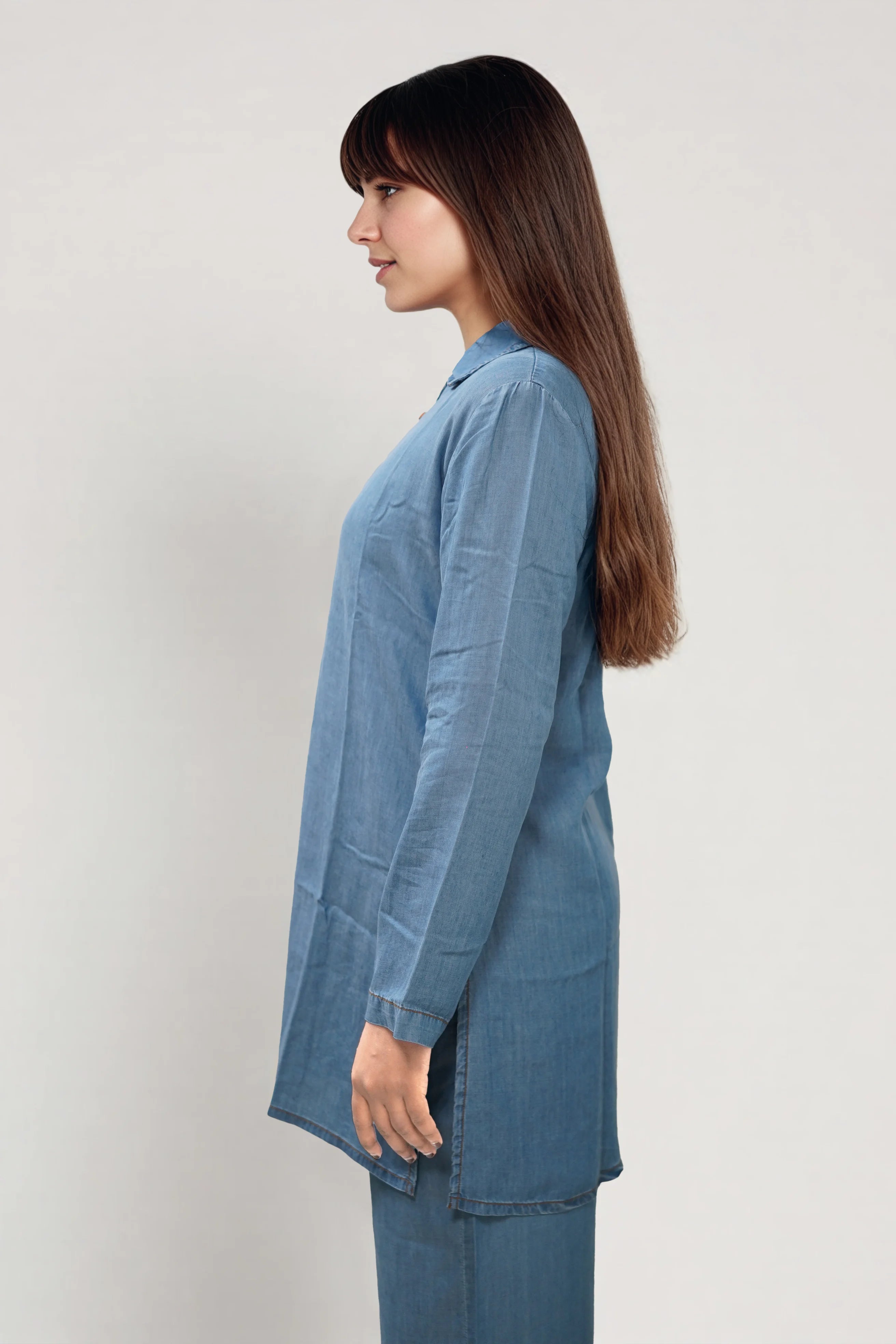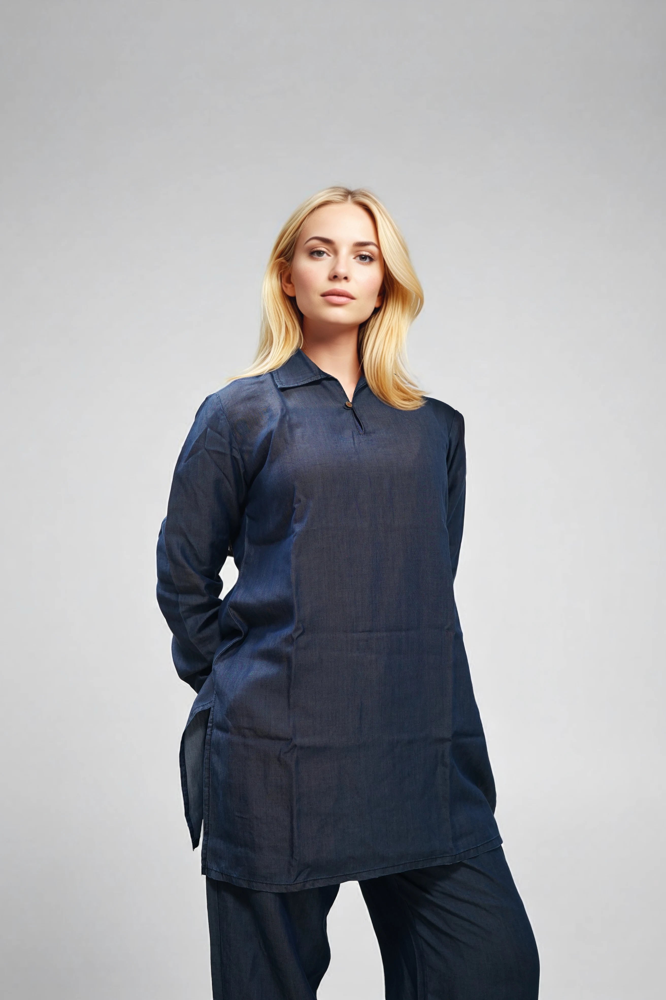 This kurti is all about understated style. Lightweight, breathable, and elegant, it’s a modern take on traditional wear. Tailored from breathable Tencel fabric, it’s lightweight and soft, finished with full sleeves and coconut shell buttons for a natural, modern look.