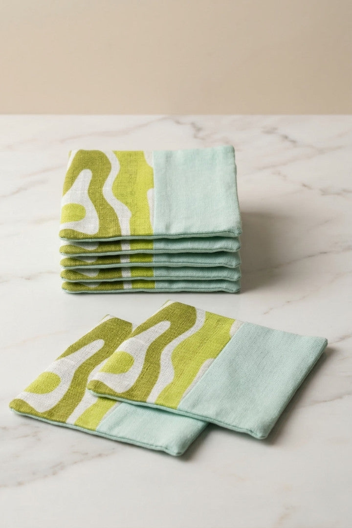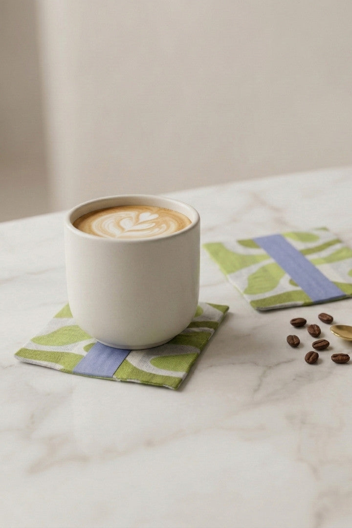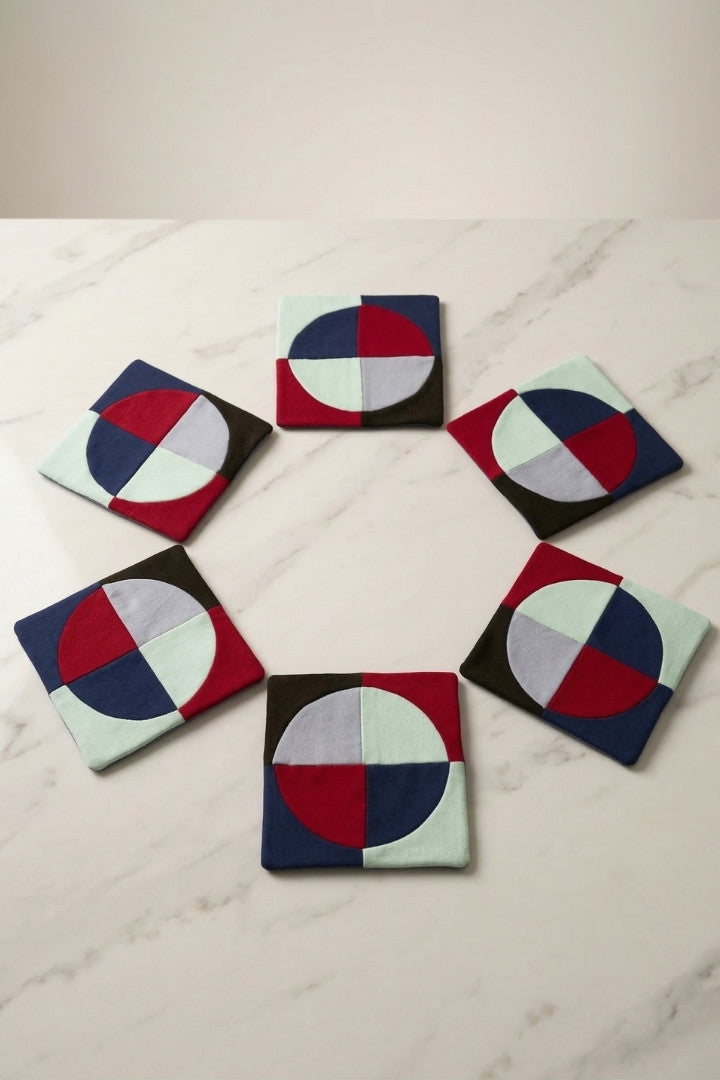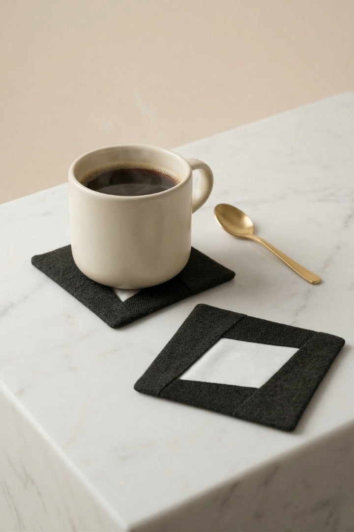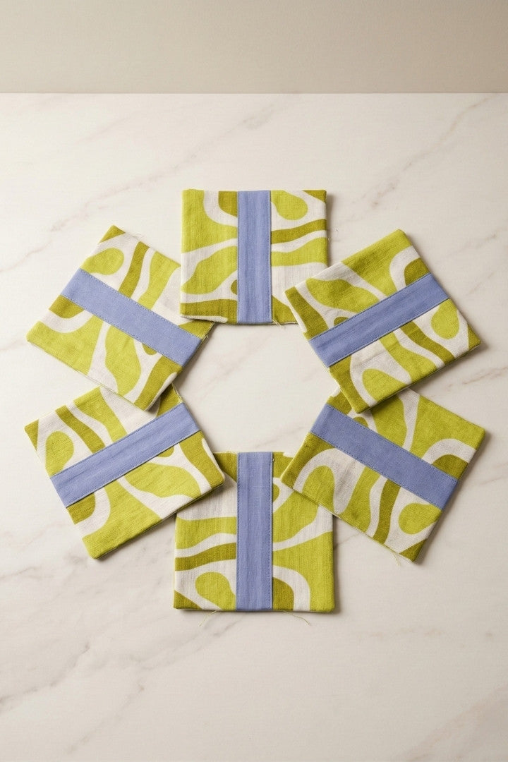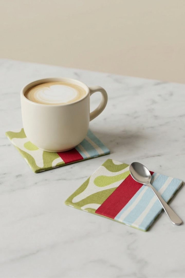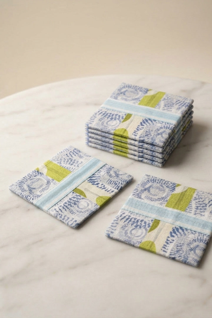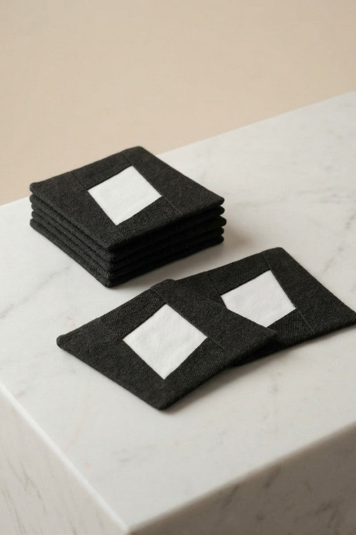 Fabric coasters made from eco-friendly materials. This reusable set of 6 protects your table from spills and heat while adding a sustainable touch.