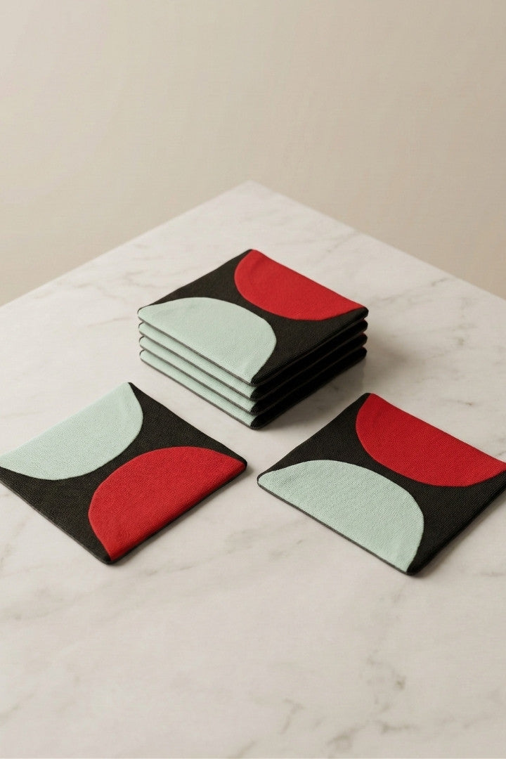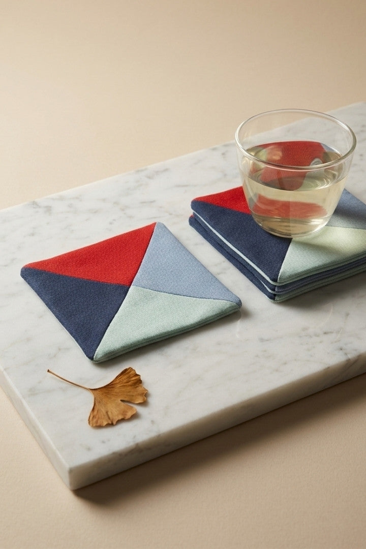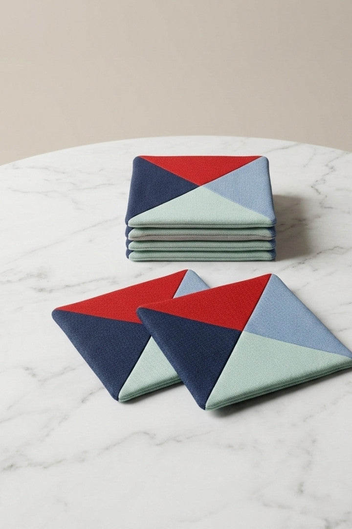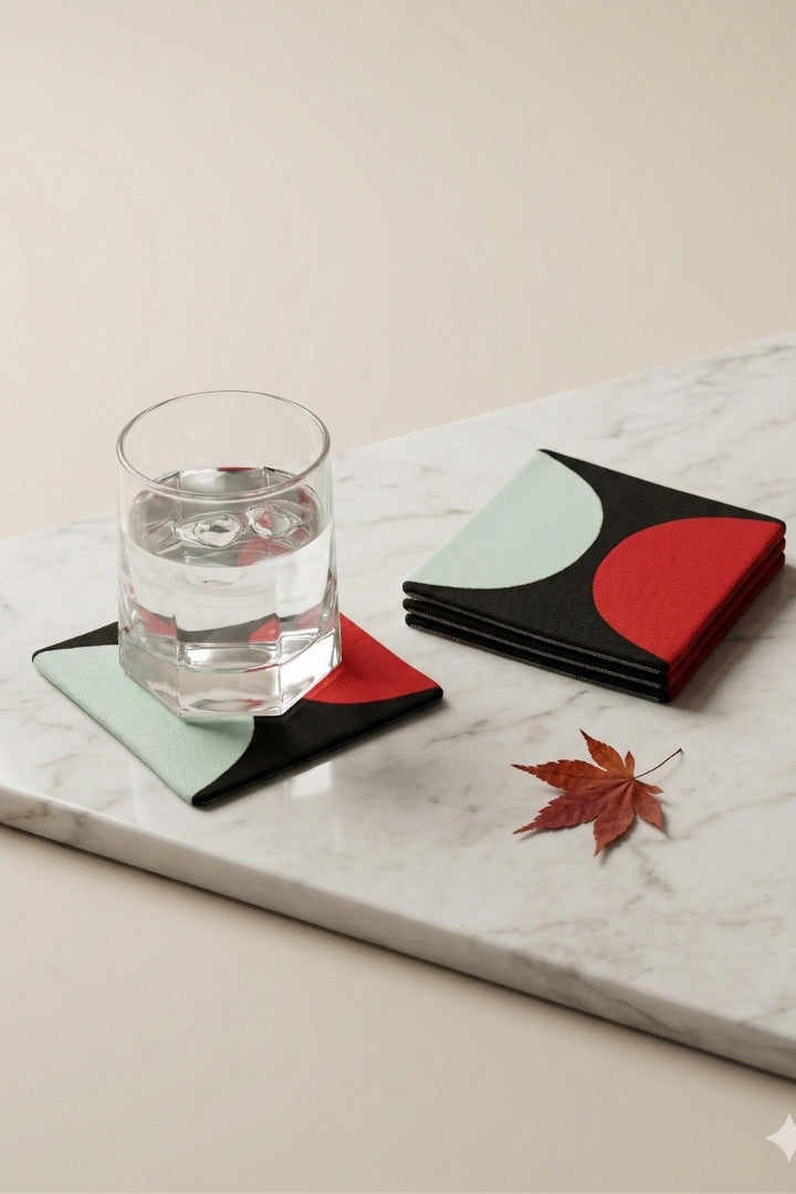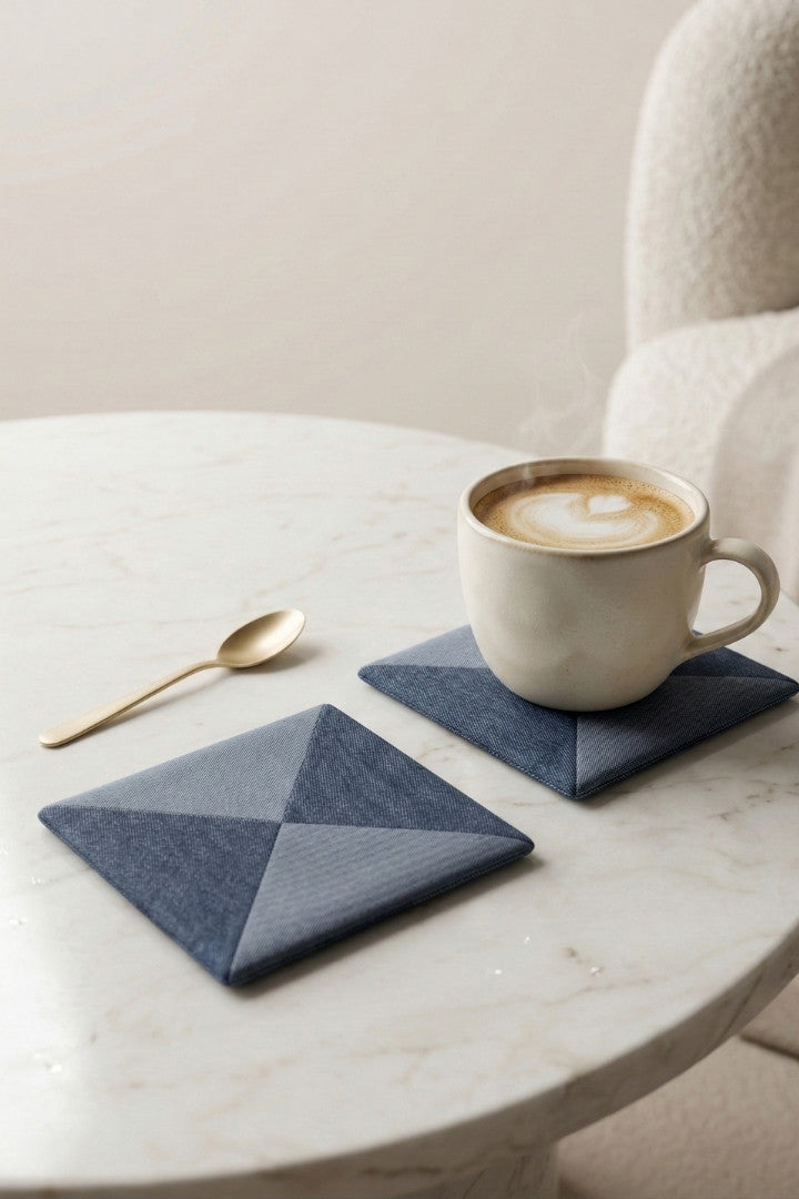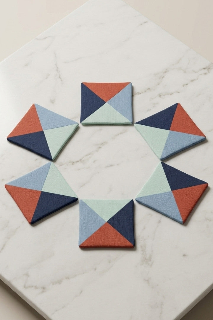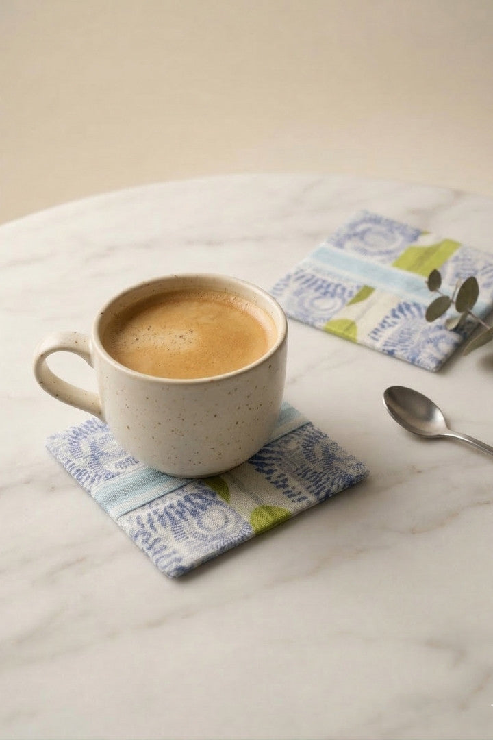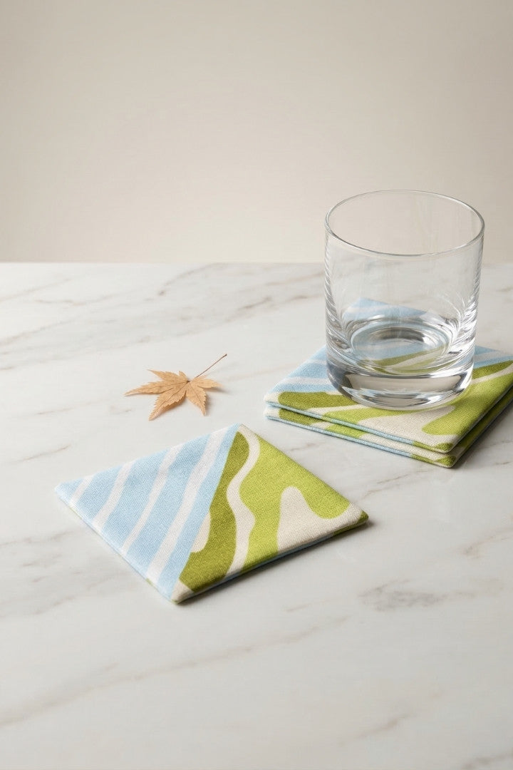 Fabric coasters made from eco-friendly materials. This reusable set of 6 protects your table from spills and heat while adding a sustainable touch.