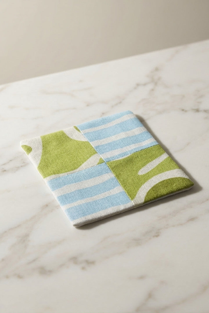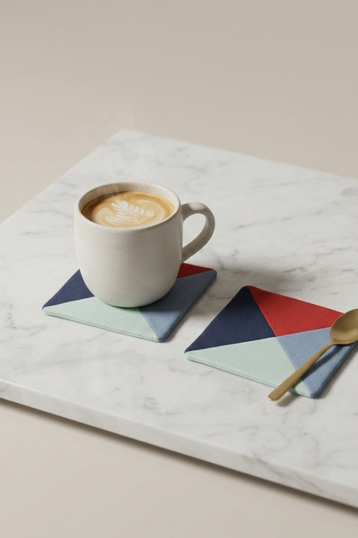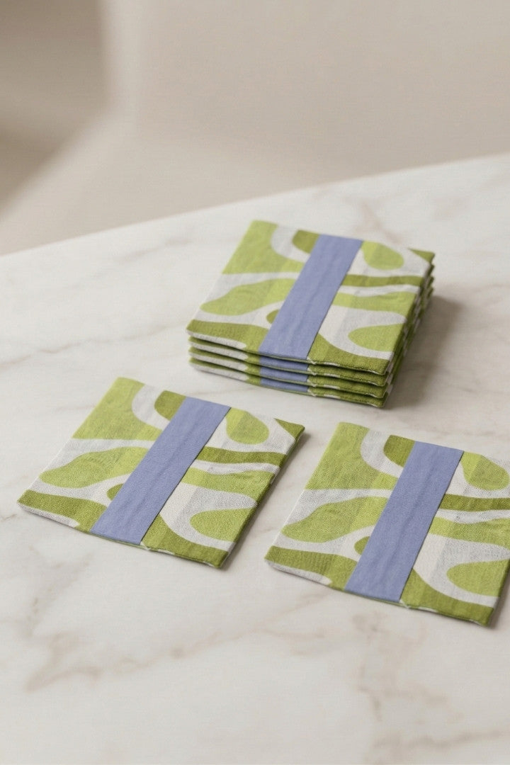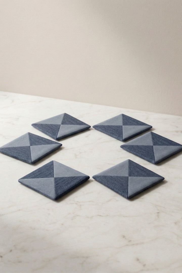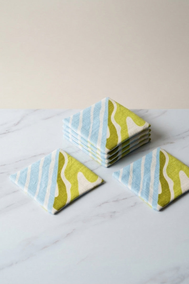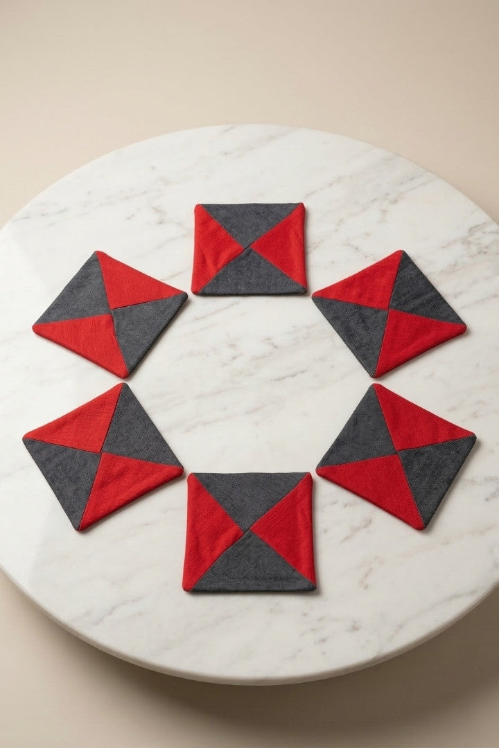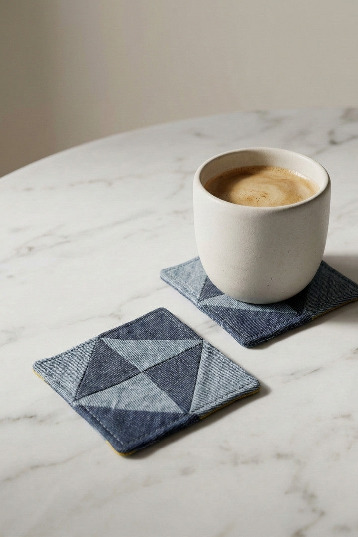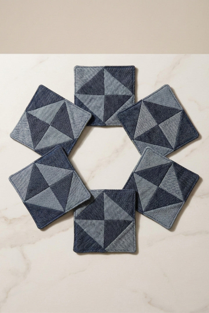 Fabric coasters made from eco-friendly materials. This reusable set of 6 protects your table from spills and heat while adding a sustainable touch.