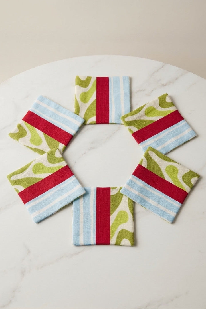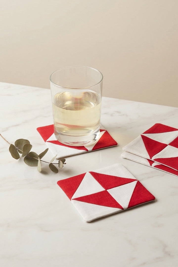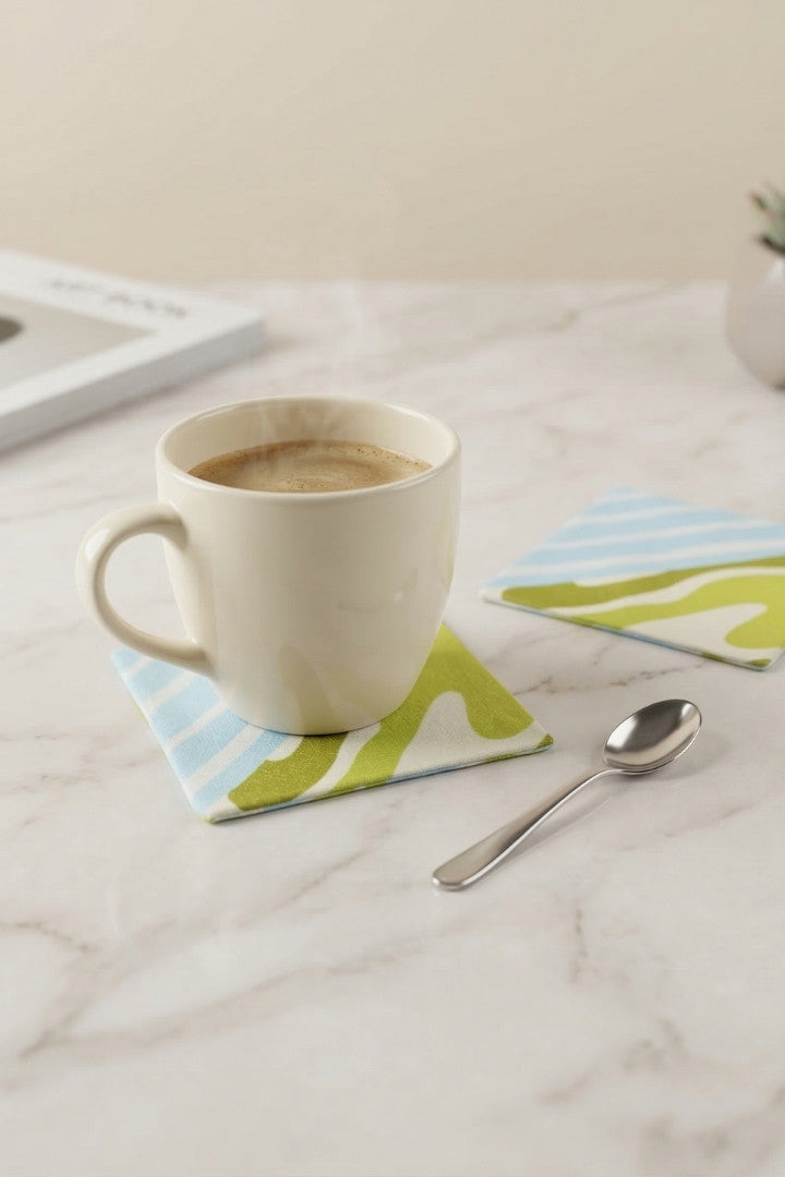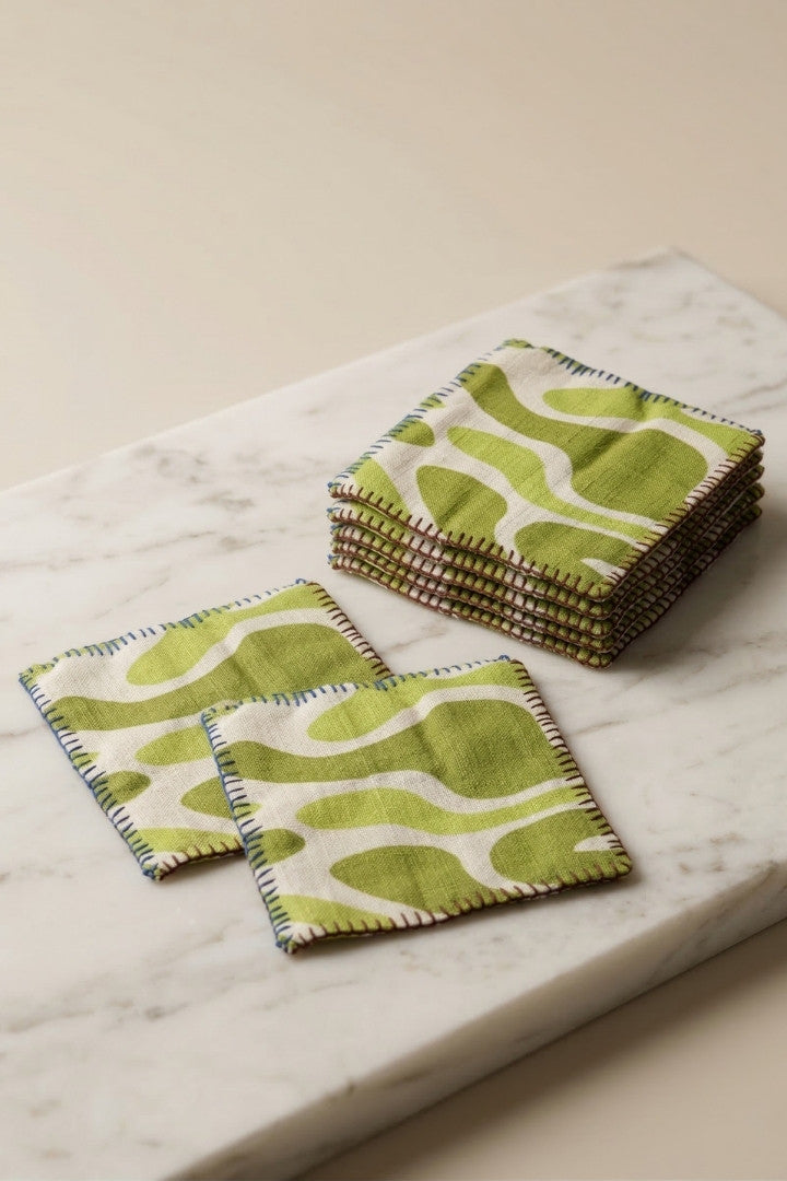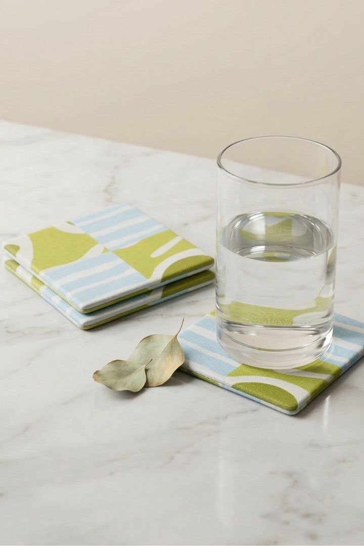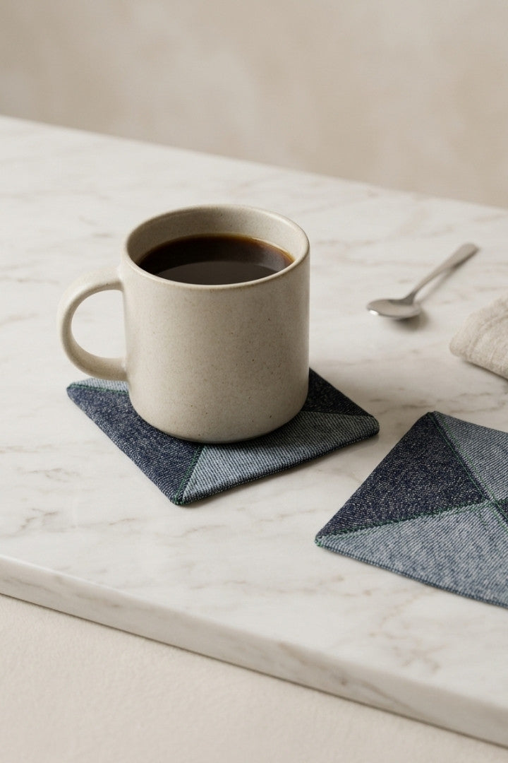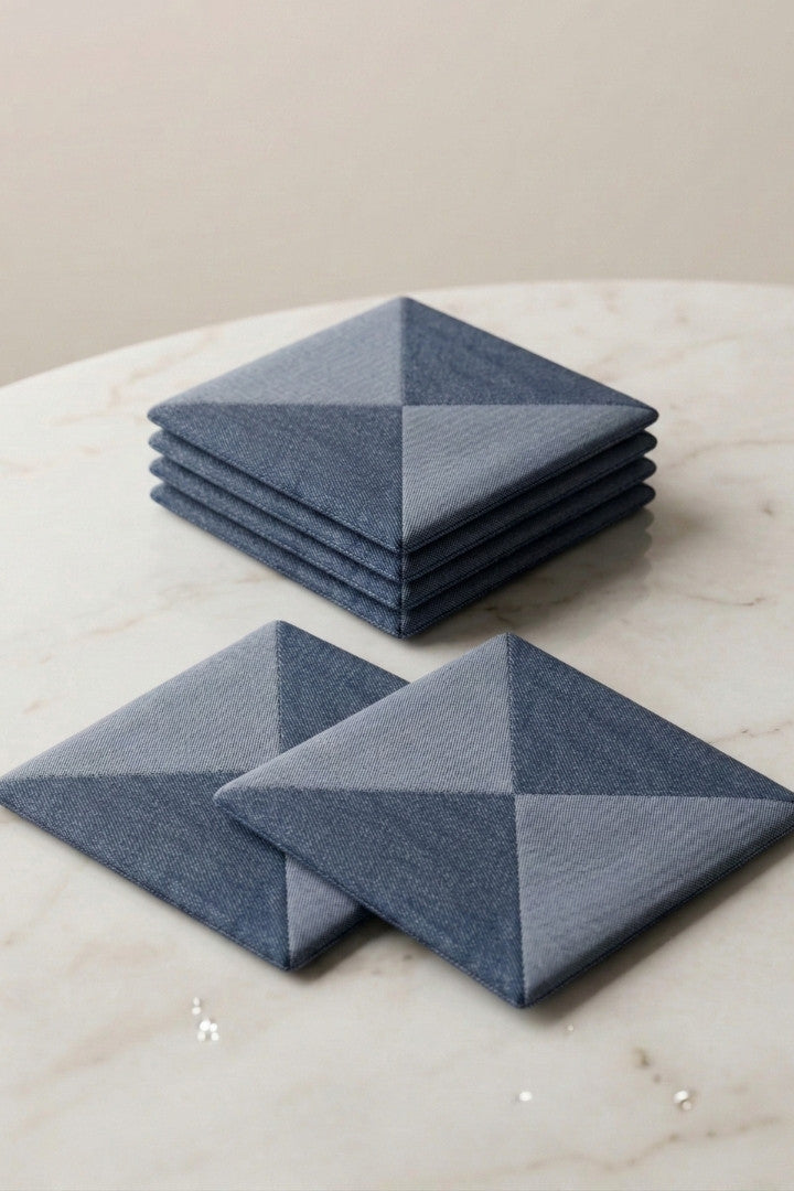 Fabric coasters made from eco-friendly materials. This reusable set of 6 protects your table from spills and heat while adding a sustainable touch.