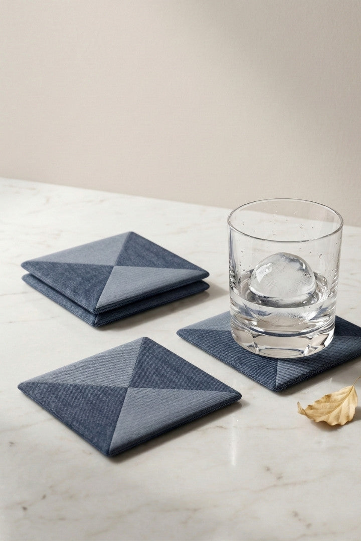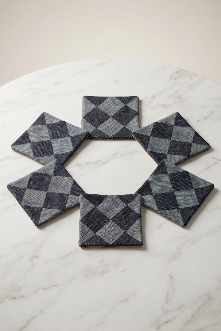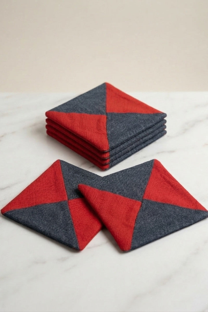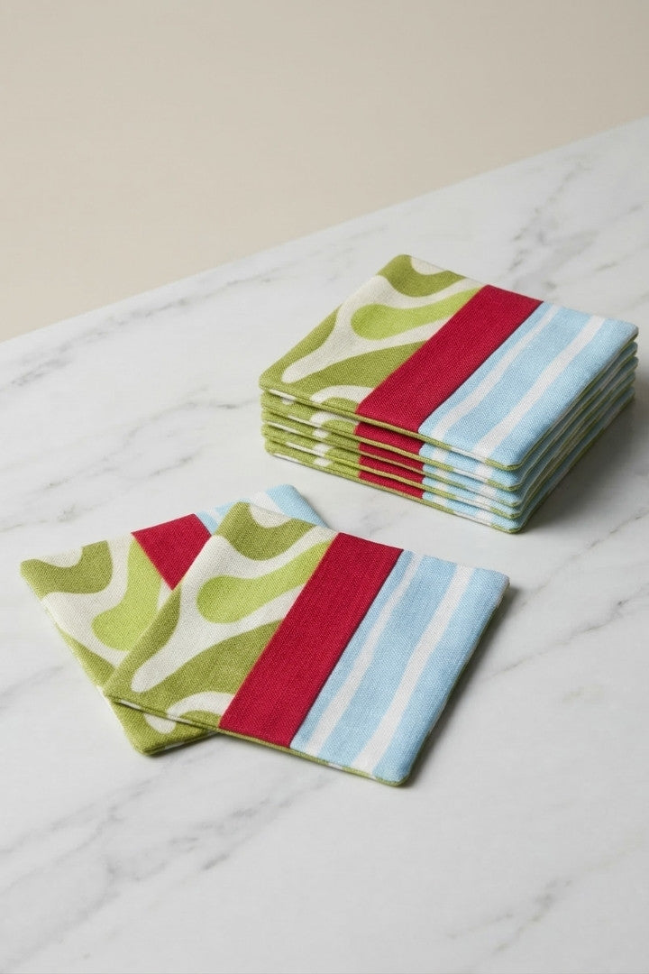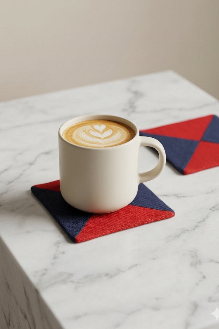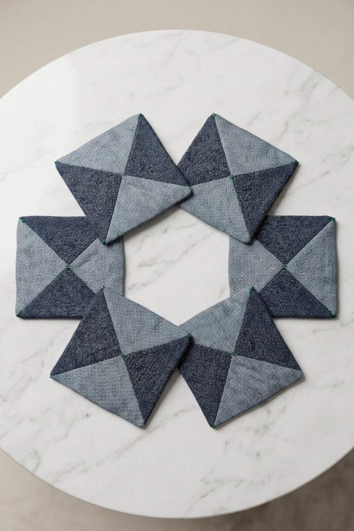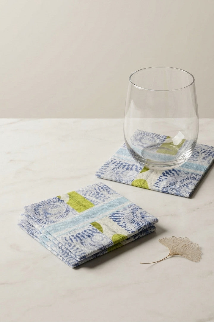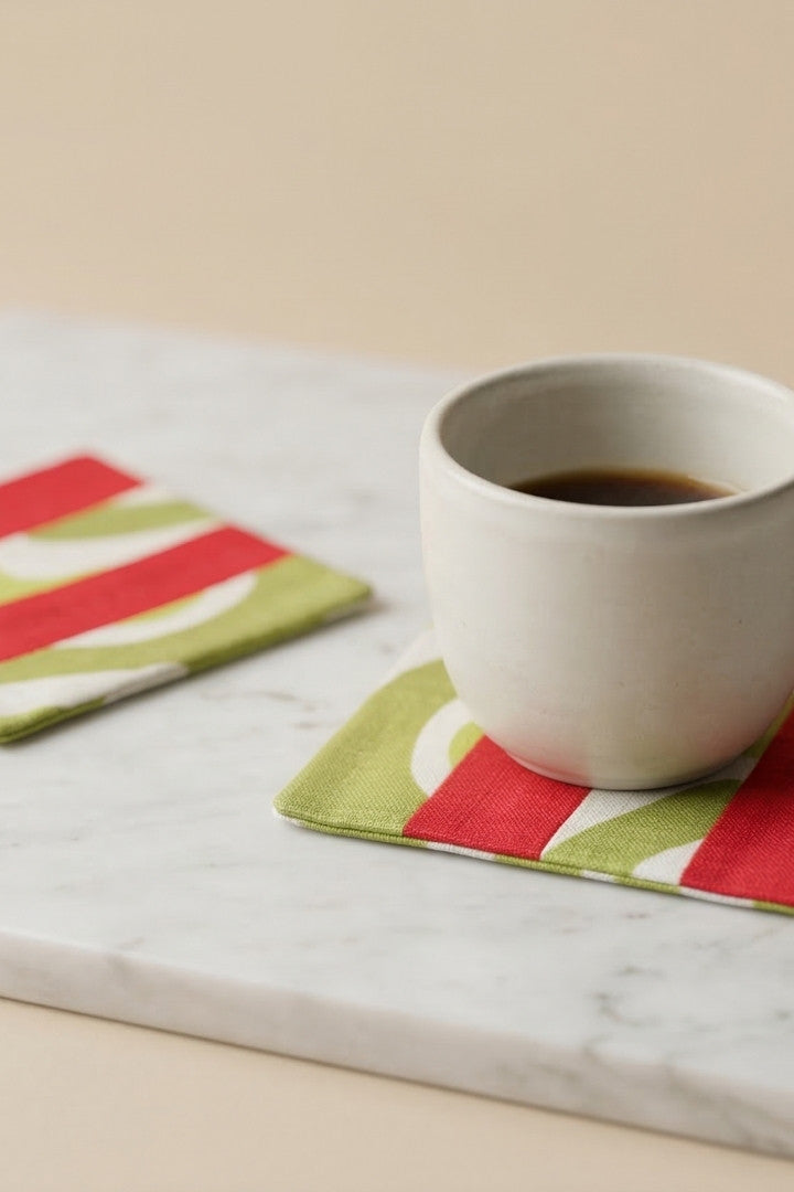 Fabric coasters made from eco-friendly materials. This reusable set of 6 protects your table from spills and heat while adding a sustainable touch.