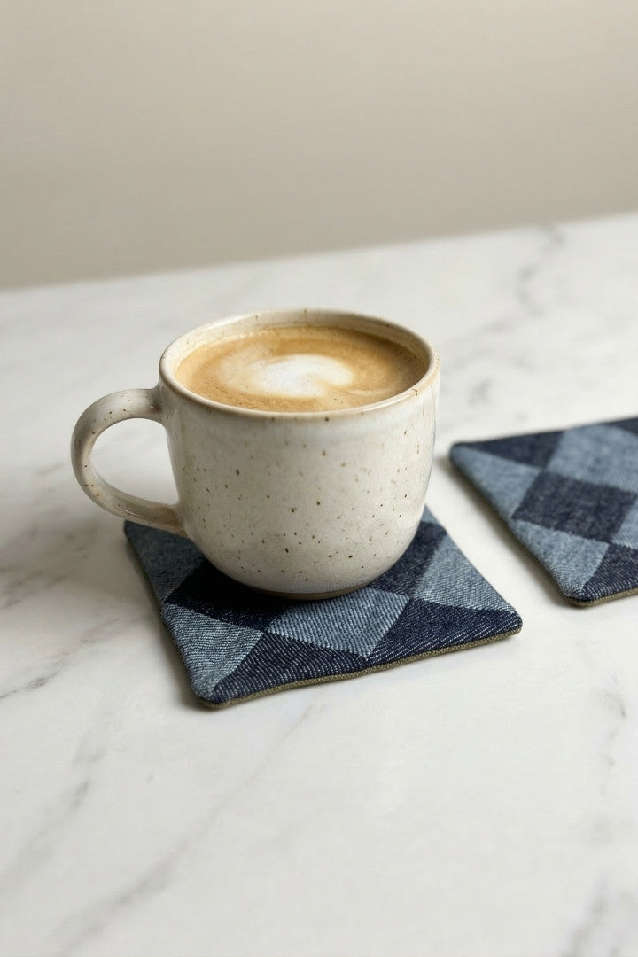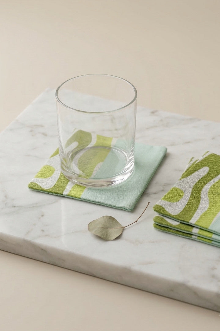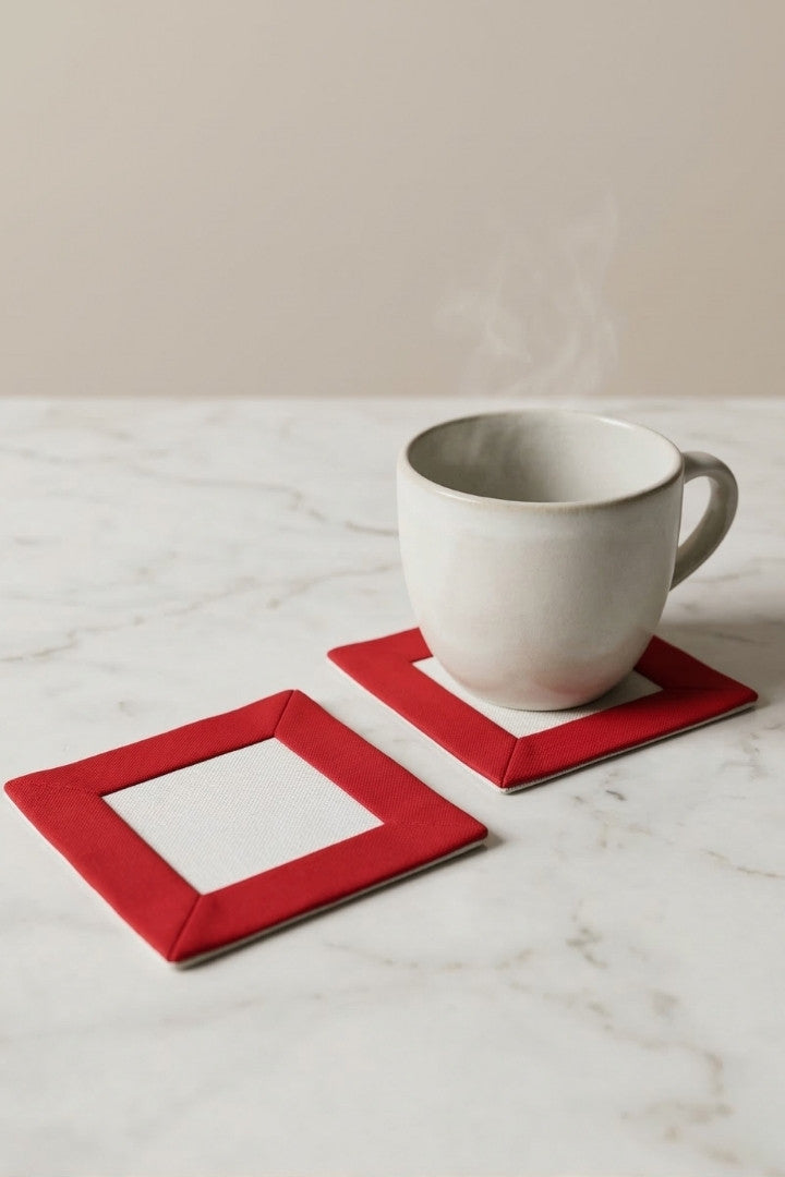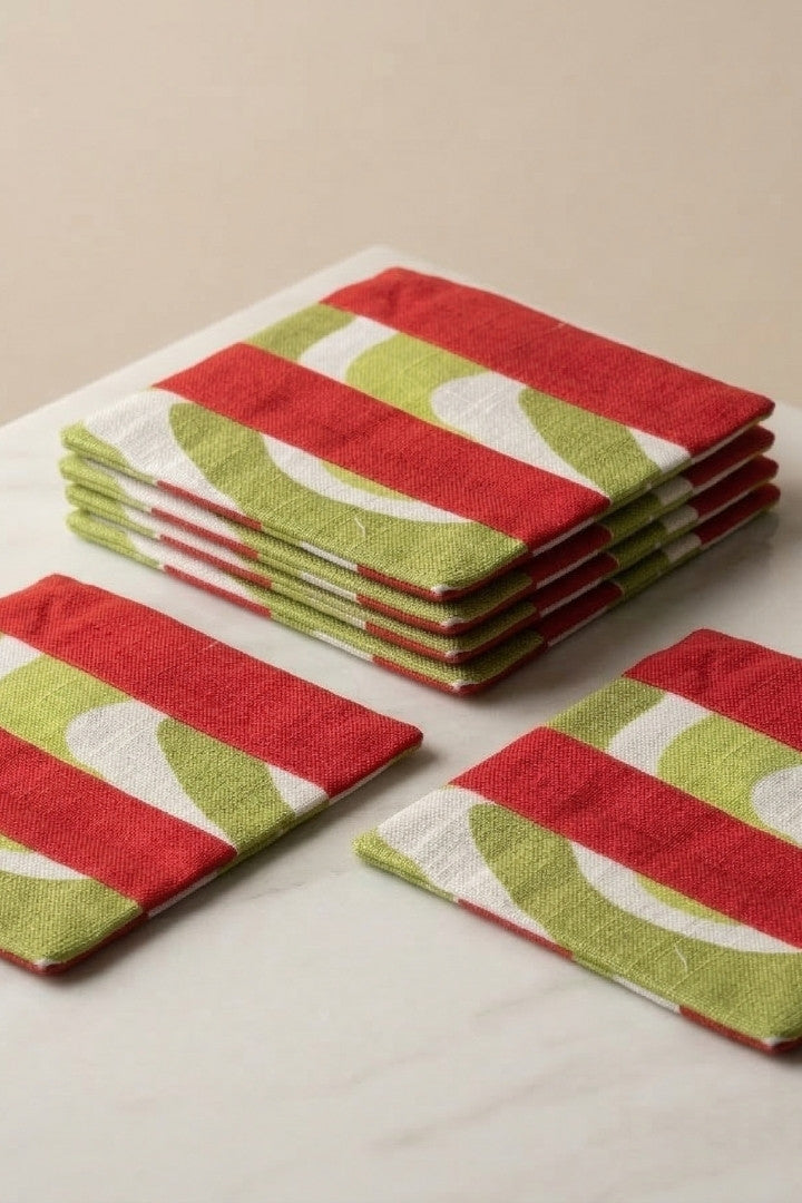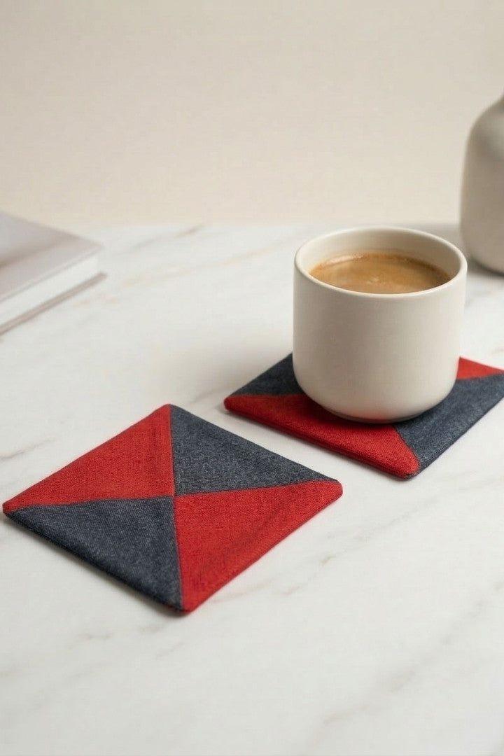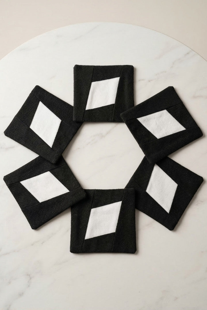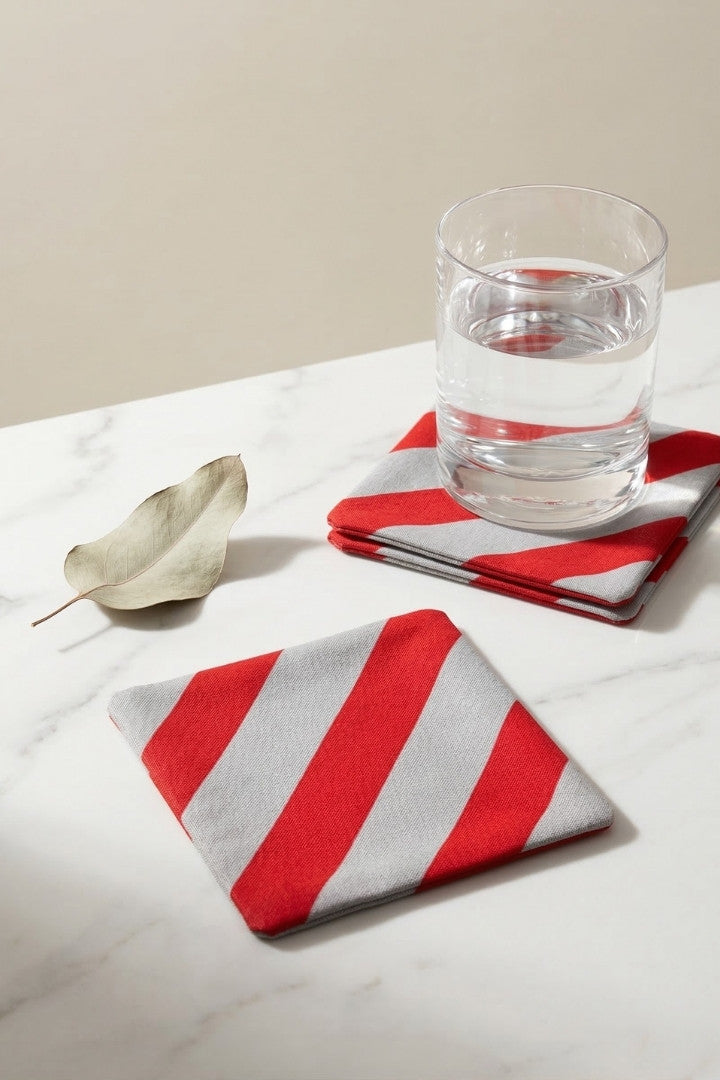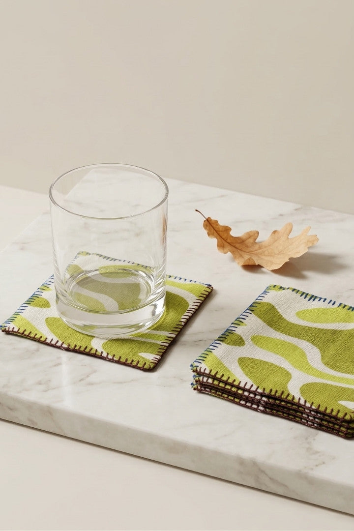 Fabric coasters made from eco-friendly materials. This reusable set of 6 protects your table from spills and heat while adding a sustainable touch.
