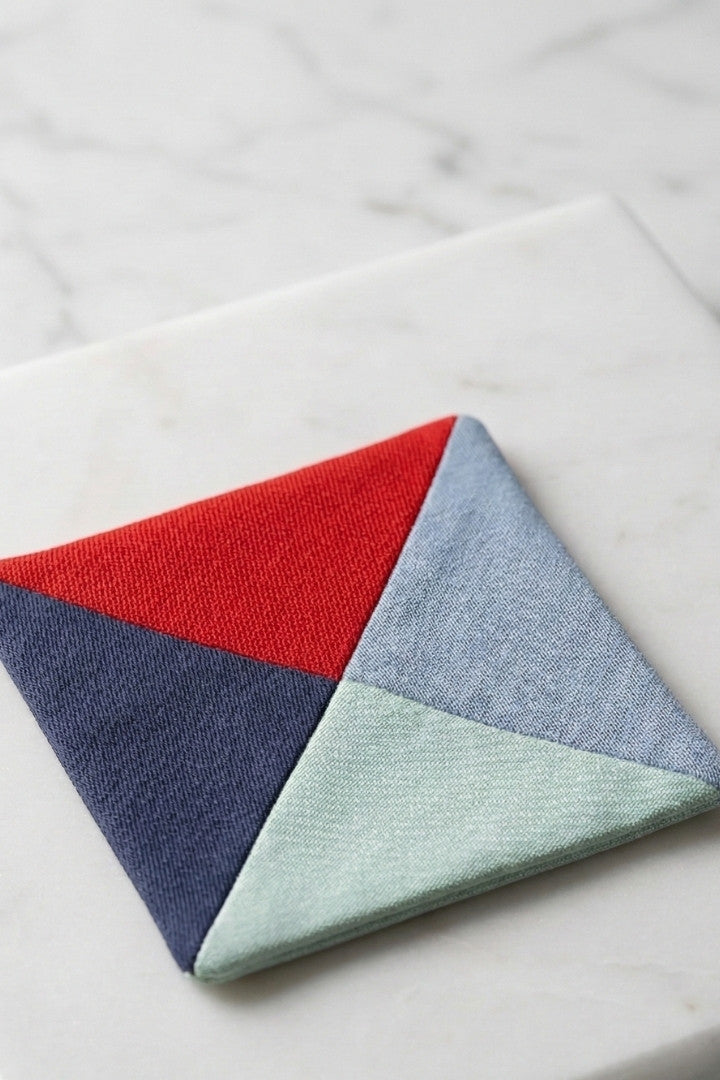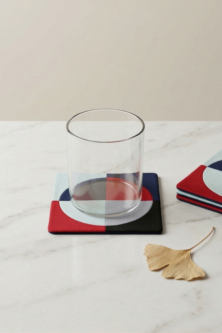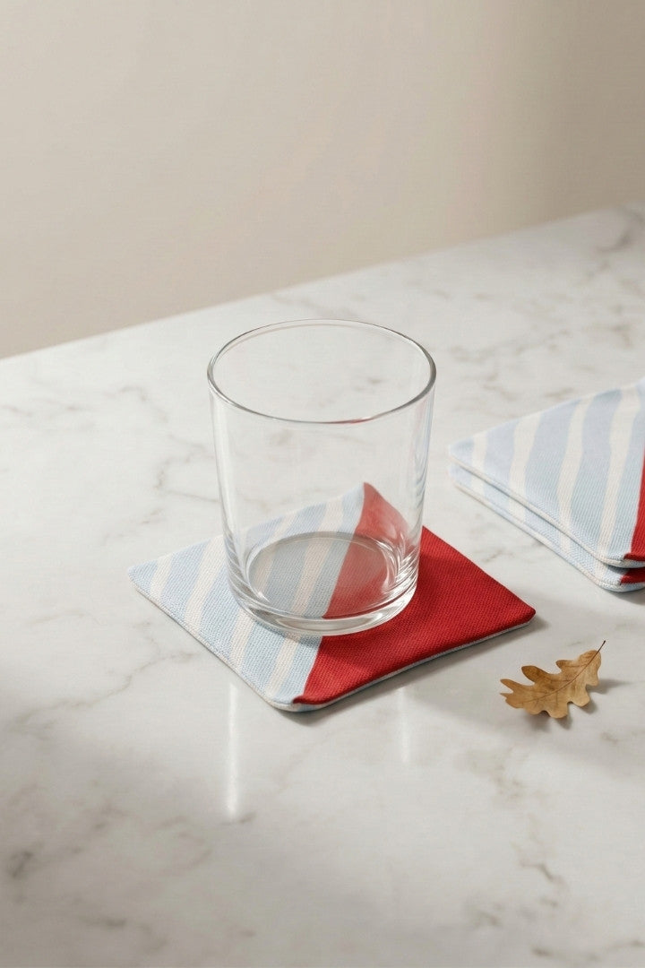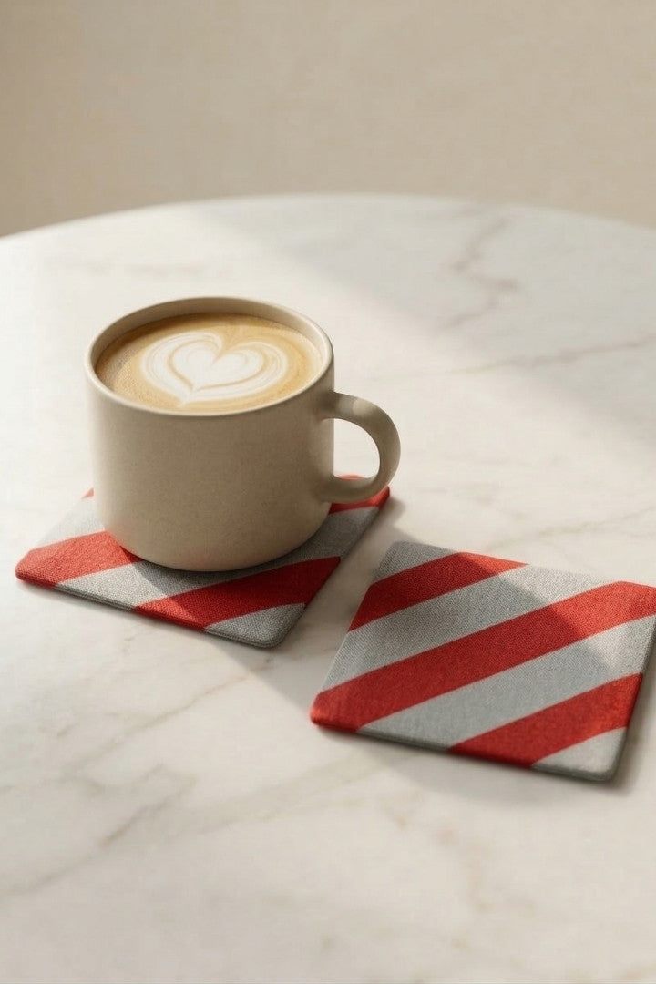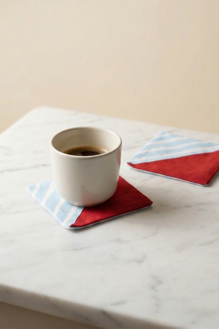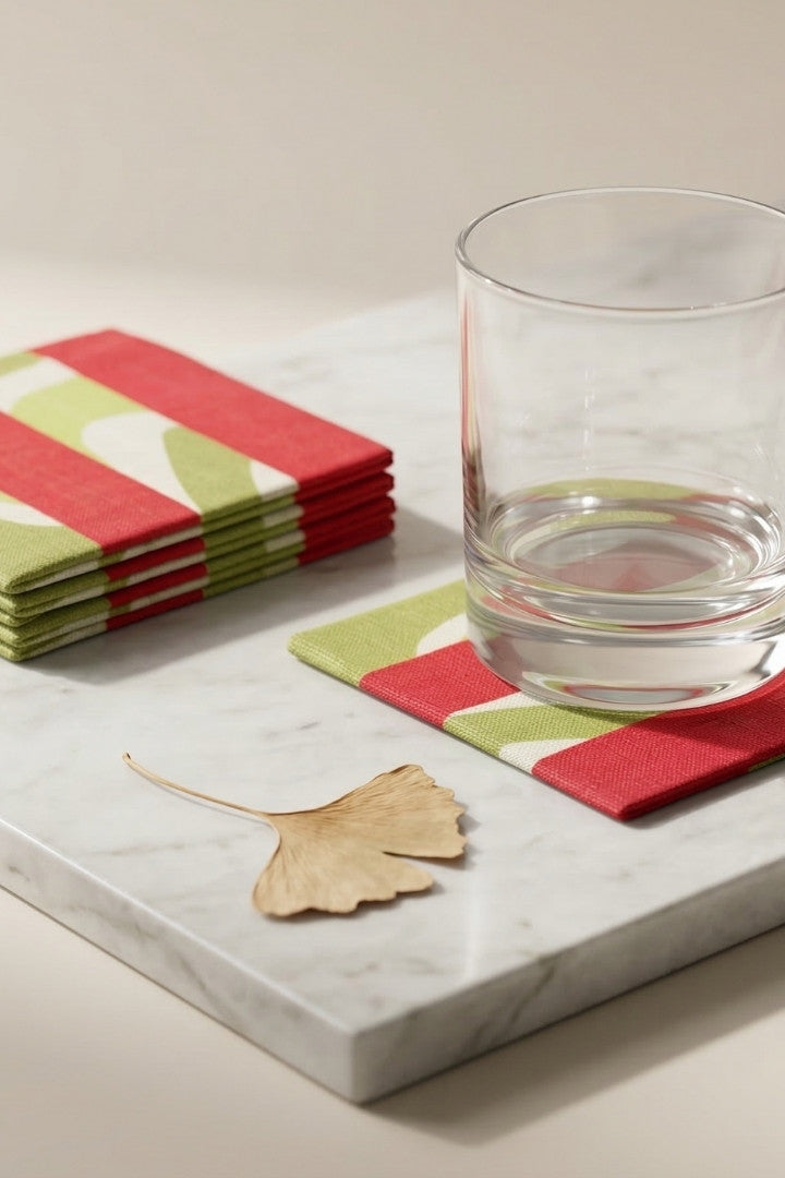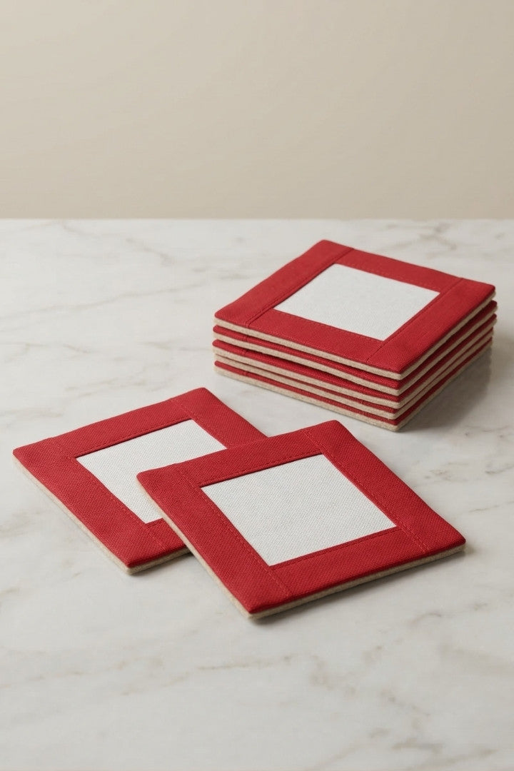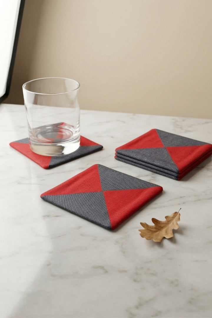 Fabric coasters made from eco-friendly materials. This reusable set of 6 protects your table from spills and heat while adding a sustainable touch.